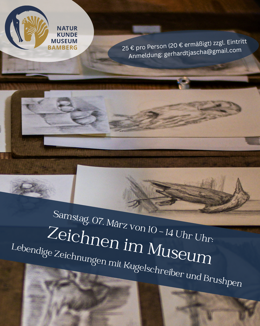 In Kooperation mit dem Künstler Jascha Gerhardt bieten wir Zeichenunterricht in unseren Ausstellungen an. Jedes Material, das einem zum Zeichnen liegt, kann mitgebracht werden. Damit entsteht dann ein ganz individuelles Stück Naturkundemuseum zum Mitnehmen.